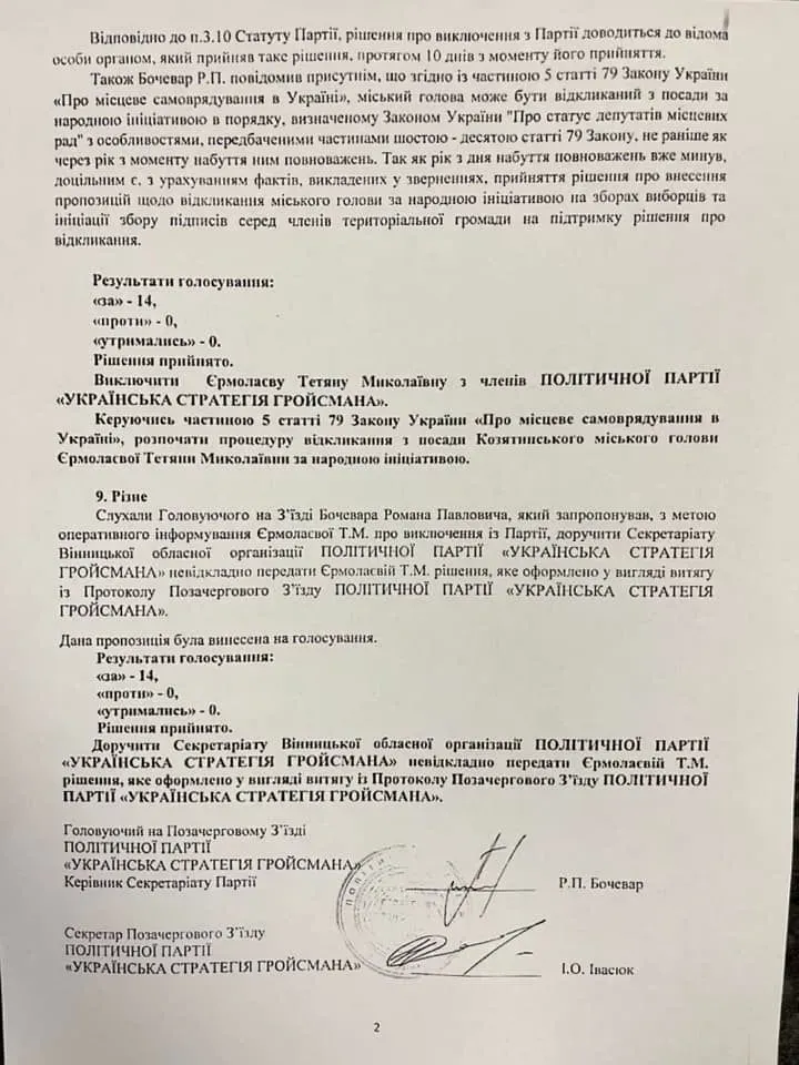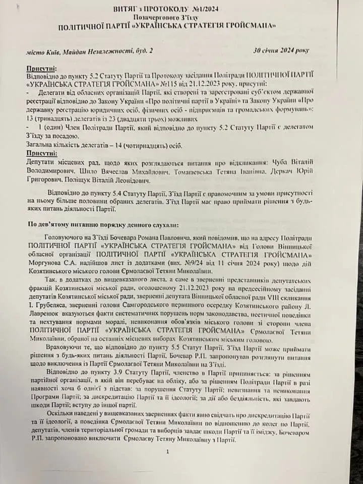 Судя по выписке из протокола, председательствующим на съезде был бывший директор департамента правовой политики и качества Винницкого городского совета Роман Бочевар. А делегатами были 14 человек.