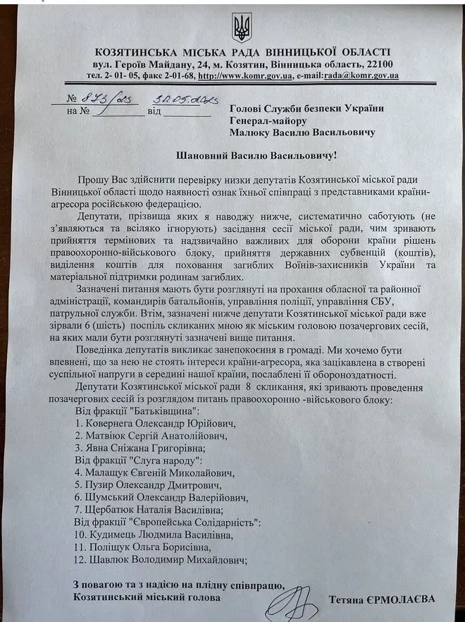 Получив должность, Ермолаева не достигла компромисса с депутатским корпусом. В мае прошлого года она даже обратилась к председателю СБУ Василию Малюку с просьбой проверить 12 депутатов Казатинского городского совета от оппозиционных фракций на предмет их возможного сотрудничества со страной-агрессором - речь идет о том, что, по ее словам, эти депутаты, якобы, срывали сессии, на которых должны были решаться вопросы помощи украинским военным и их семьям.