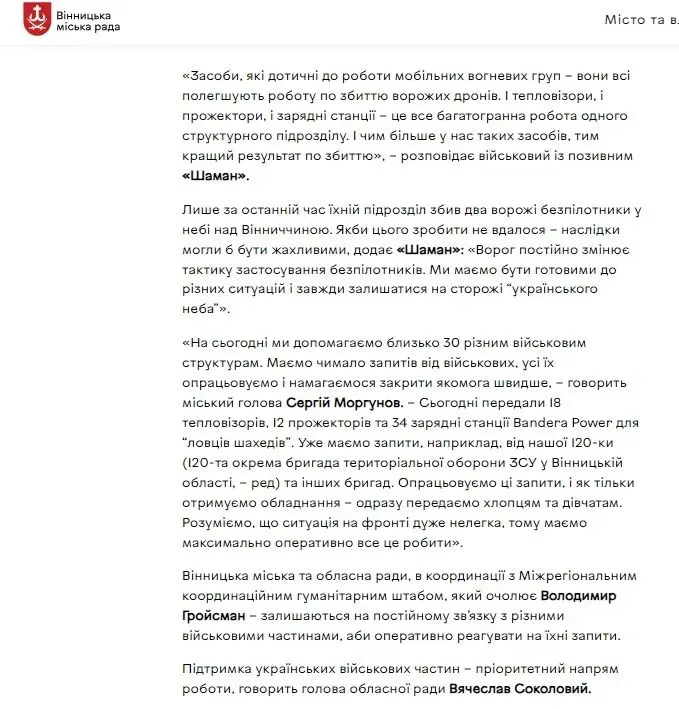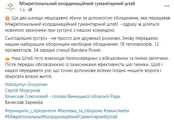 В частности, на прошлой неделе пресс-службы Винницкого областного и городского советов и штаб отчитались о передаче одной из воинских частей 18 тепловизоров, 12 прожекторов и 34 зарядных станций Bandera Power для "ловцов шахедов". Передавали их Соколовый и Моргунов.