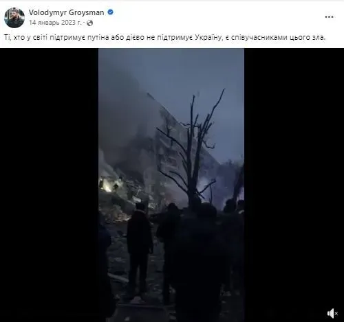 В частности, нам известно, что Гройсмана не было в Украине 14 января 2023 года, но в этот день он где-то за границей на своей странице в Facebook возмущается ужасным ракетным ударом врага по многоэтажке в Днепре.