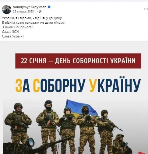 22 января экс-премьер размещает сообщение-поздравление с Днем Соборности Украины, но делает это тоже, находясь за пределами нашего государства.