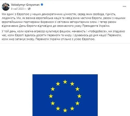 9 мая 2023 года видим сообщение по случаю Дня Европы. Гройсман в этот день тоже не в Украине. Поэтому, нельзя исключать, что вдохновение для сообщения экс-премьер искал в одной из стран Европы.