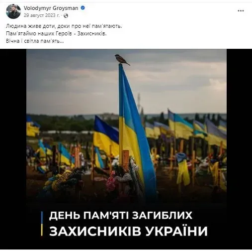 29 августа Гройсман вместе с миллионами украинцев скорбит по погибшим защитникам Украины. Но миллионы украинцев делают это в родной стране, экс-премьер - опять же за ее пределами.