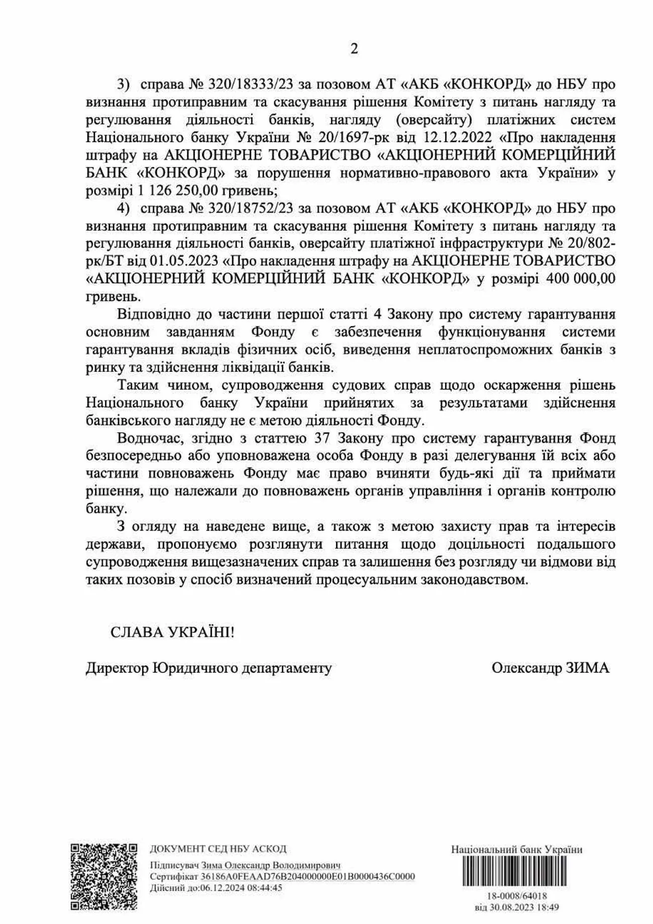 Речь идет об уголовном производстве, открытом в конце 2023 года по ч. 2 ст. 364 Уголовного кодекса Украины - злоупотребление властью или служебным положением, повлекшее тяжкие последствия. По данным УНН, основанием для открытия дела стало служебное письмо за подписью главного юриста НБУ Александра Зимы, который одновременно является председателем Административного совета Фонда гарантирования вкладов физических лиц, адресованное Фонду. В документе чиновник от имени Национального банка Украины дал "рекомендацию" ФГВФЛ отозвать из суда иски, поданные против НБУ представителями банка "Конкорд" еще до старта процесса его ликвидации. В исках "Конкорд" обжаловал штрафы на сумму около 63,5 миллиона гривен, наложенные регулятором.