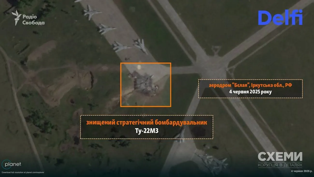 Снимки Planet Labs опубликовал проект Радио Свобода "Схемы". Спутник зафиксировал, в частности, повреждения семи стратегических бомбардировщиков. На фотографиях видны и последствия пожаров.