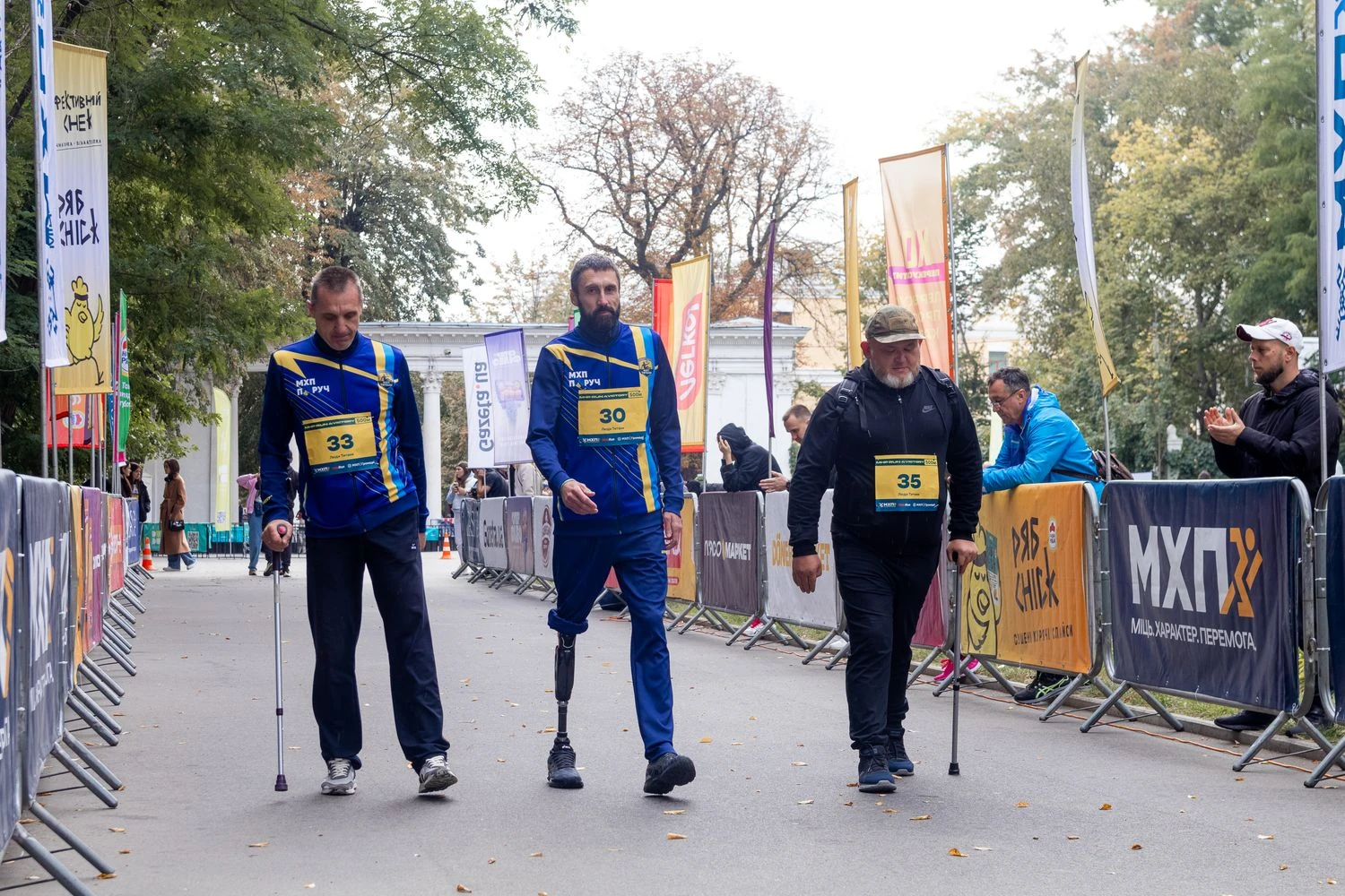 Среди них — Александр Мафтиор, ветеран и работник Винницкой птицефабрики МХП, присоединился на дистанции 2 км. Во время контрнаступления на южном направлении он получил тяжелое ранение, наступив на противопехотную мину. После лечения и протезирования вернулся к работе и активно участвует в инклюзивных спортивных соревнованиях.
