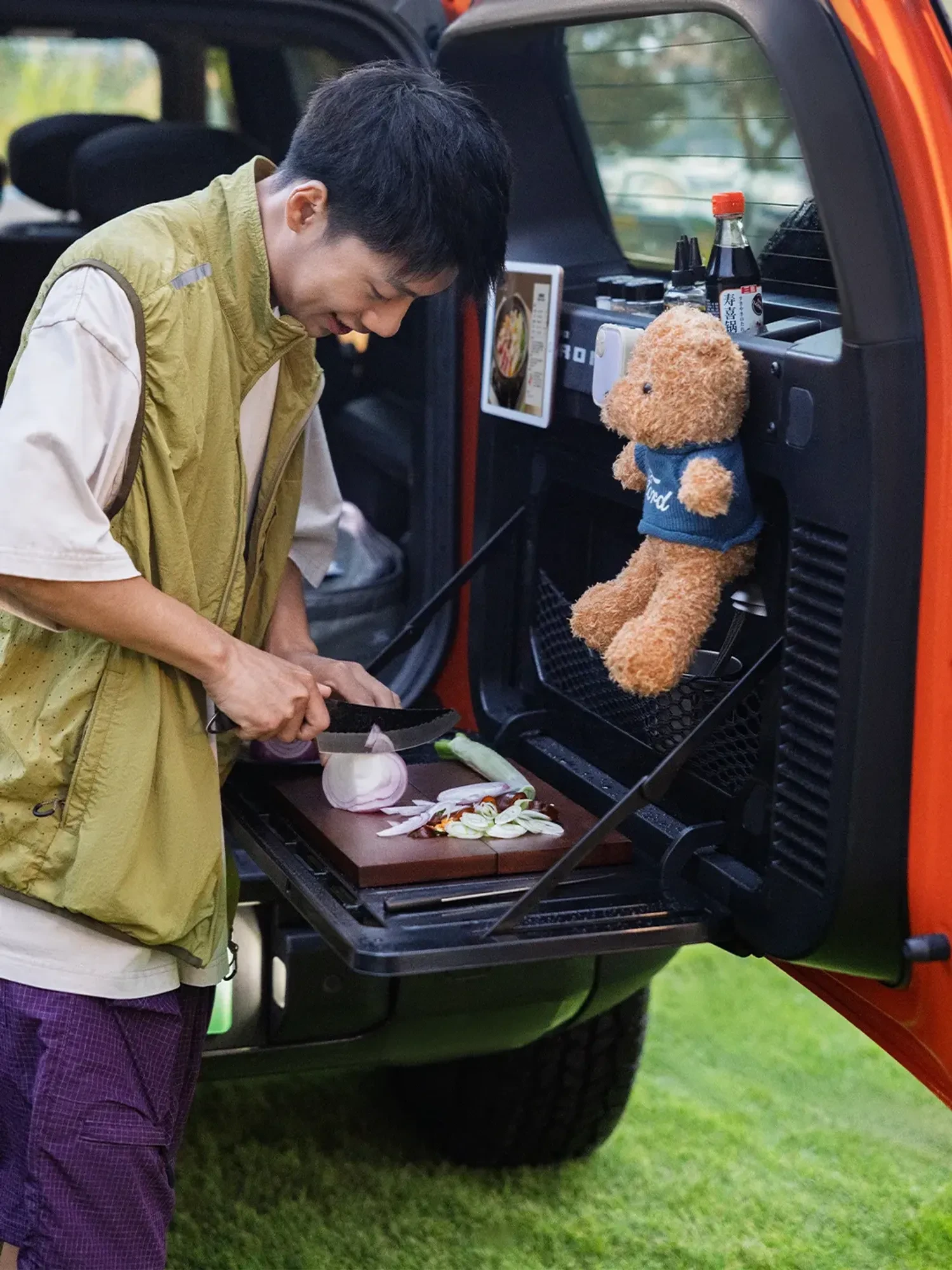 В отличие от большинства подъемных систем, крышу можно поднять простым нажатием кнопки на экране информационно-развлекательной системы. А еще есть задний борт, похожий на походную кухню. В комплект входят стол, магнитная полоса для ножей, открывалка для бутылок и многое другое.