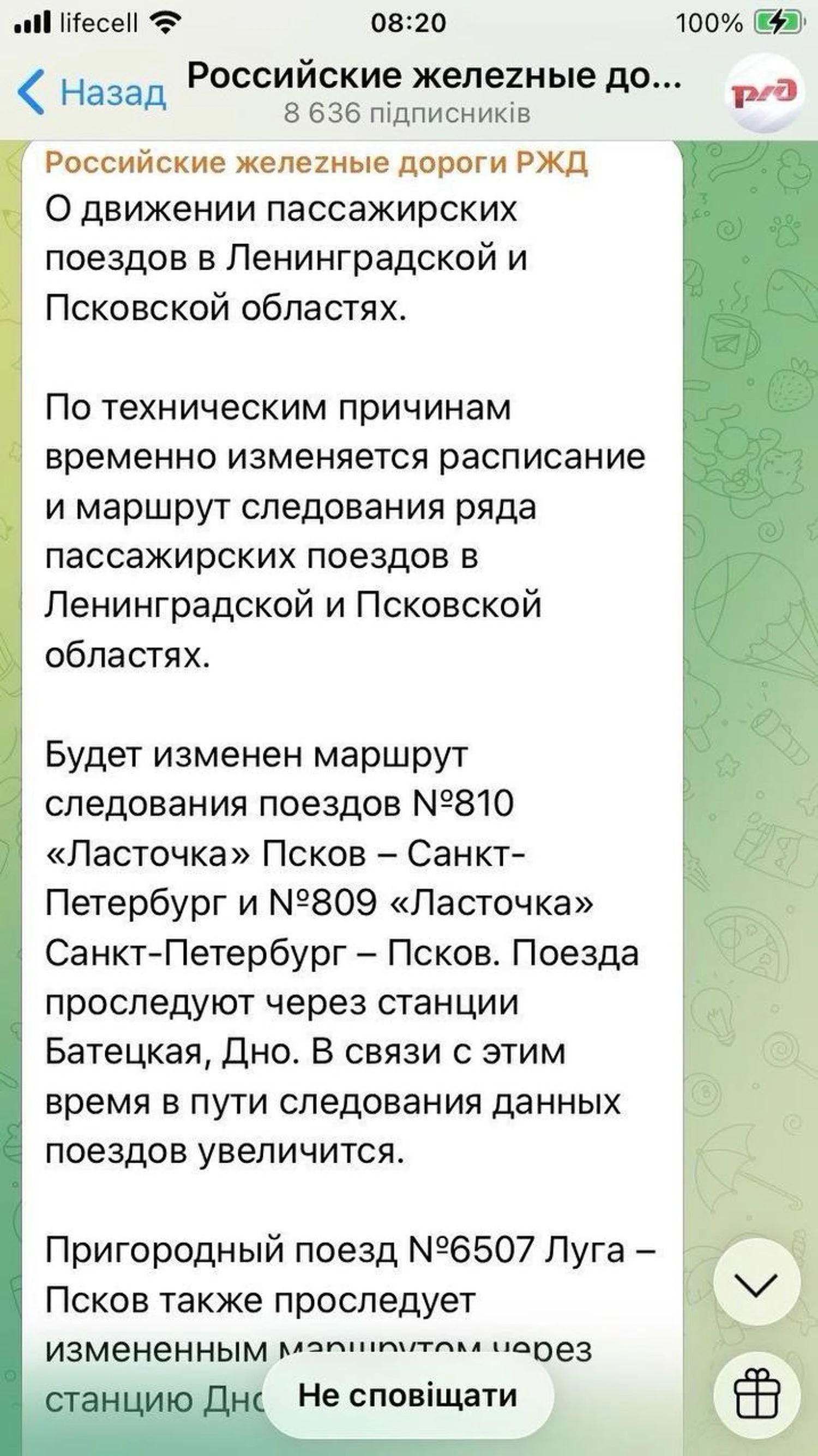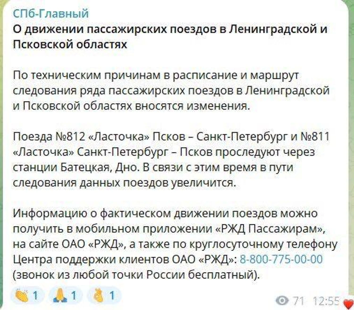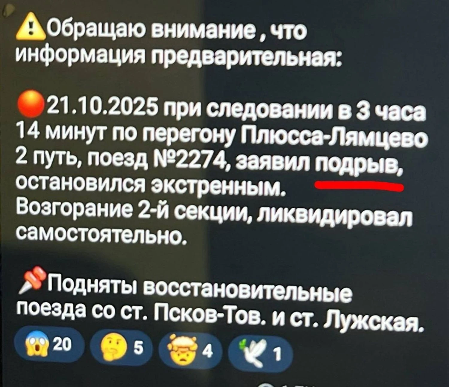 Ночью 21 октября произошел подрыв железнодорожных путей на одном из перегонов железнодорожного сообщения псков - санкт-петербург, которое используется для военной логистики врага. Об этом пишет УНН со ссылкой на источники.