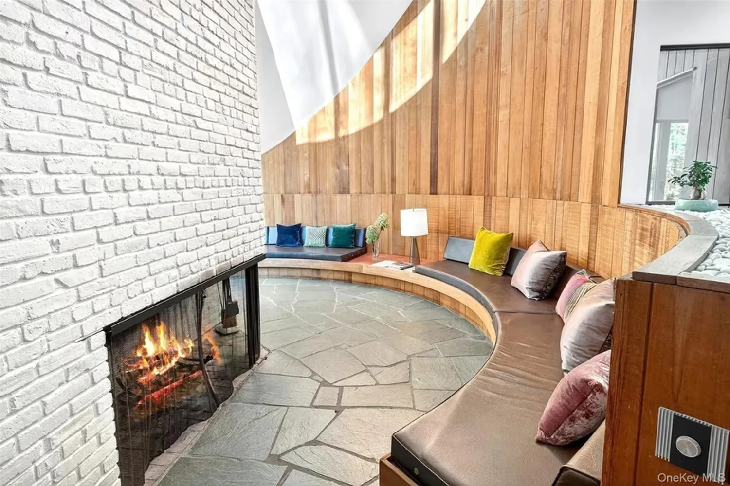 Стеклянные стены позволяют интерьеру быть наполненным солнечным светом, а эффектно изогнутая гостиная с кирпичным камином была спроектирована так, чтобы имитировать "чувственное погружение, типичное для концертных залов Сторика".