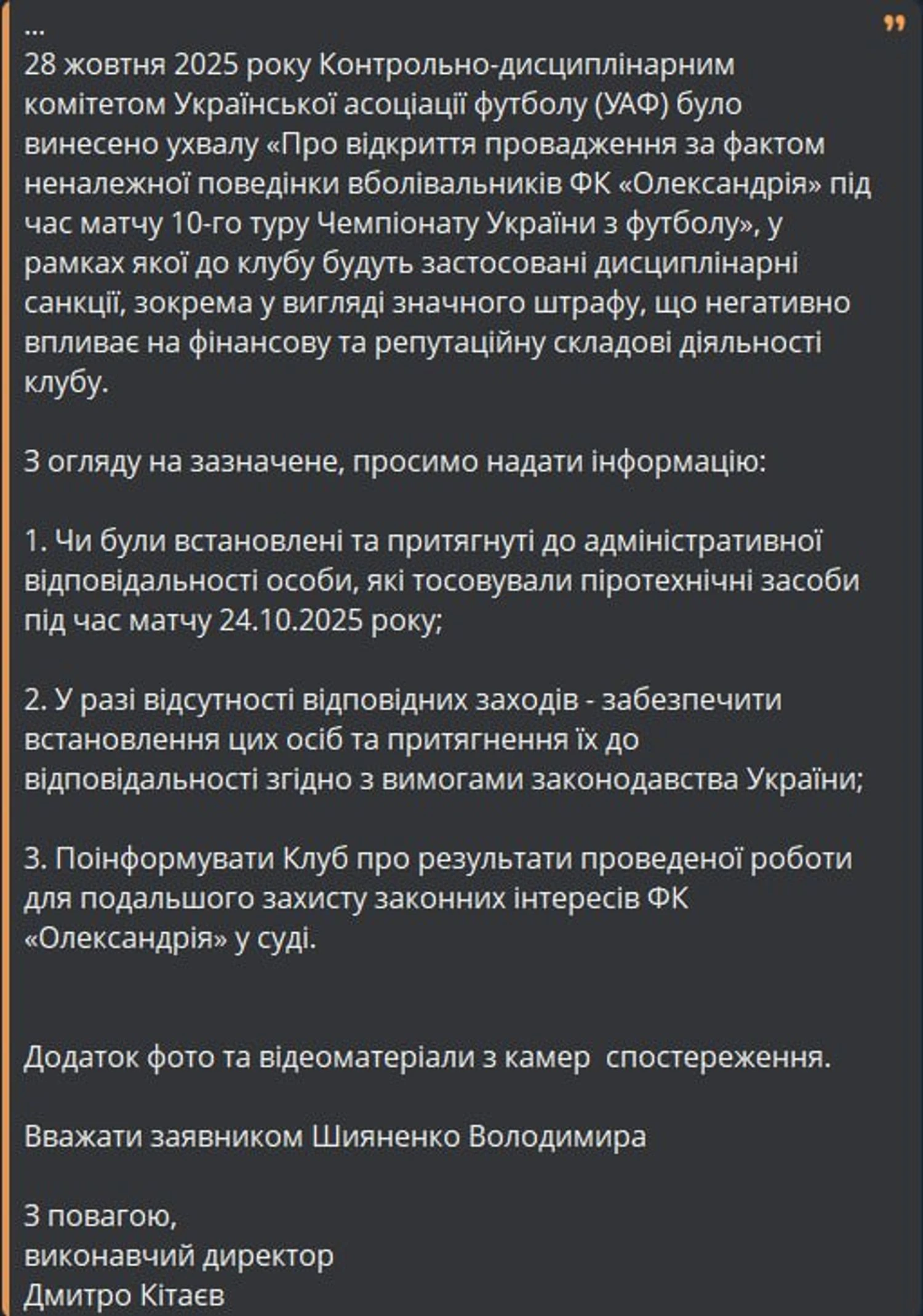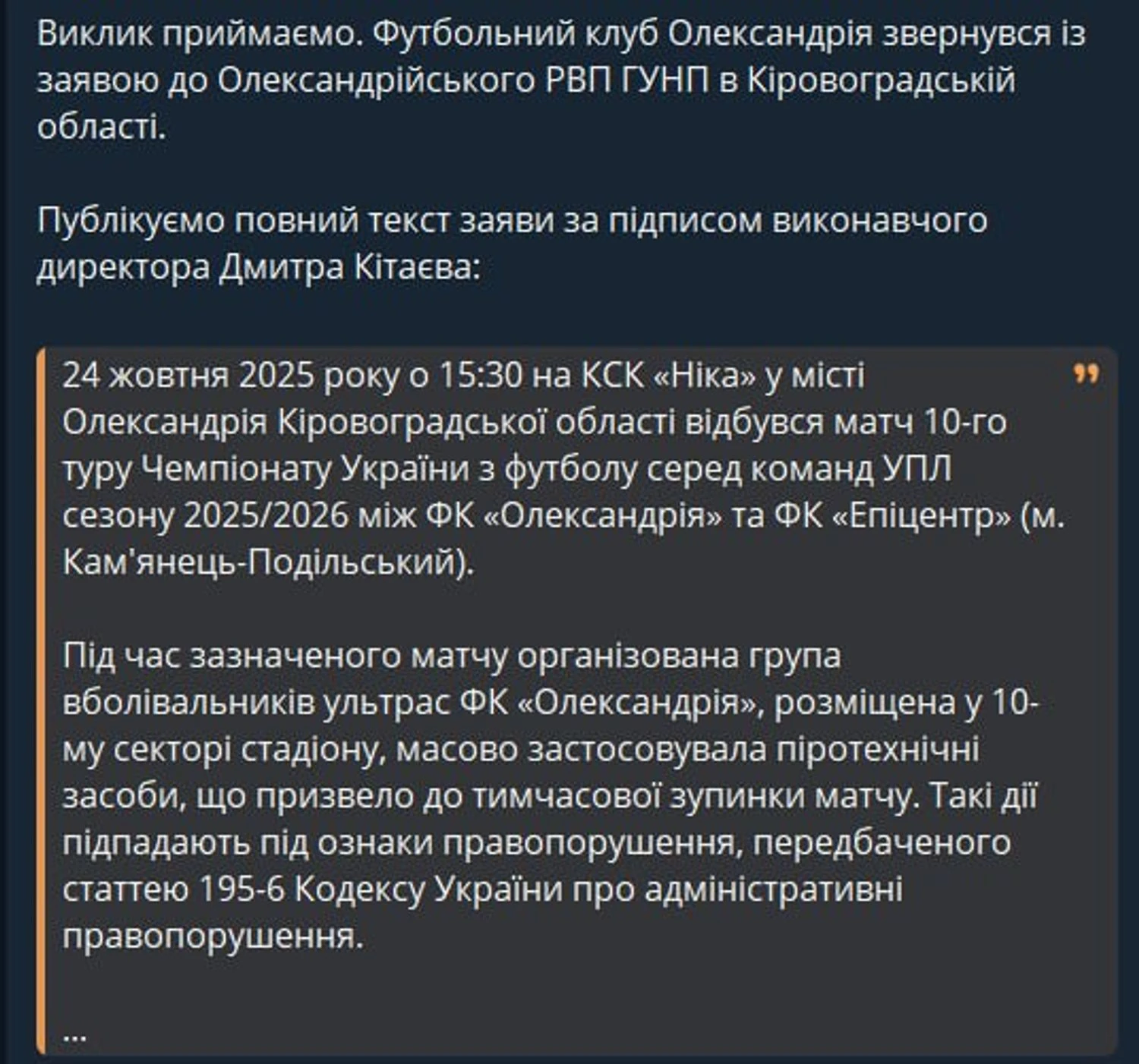 "24 октября 2025 года в 15:30 на КСК "Ника" в городе Александрия Кировоградской области состоялся матч 10-го тура Чемпионата Украины по футболу среди команд УПЛ сезона 2025/2026 между ФК "Александрия" и ФК "Эпицентр" (г. Каменец-Подольский). Во время указанного матча организованная группа болельщиков ультрас ФК "Александрия", размещенная в 10-м секторе стадиона, массово применяла пиротехнические средства, что привело к временной остановке матча. Такие действия подпадают под признаки правонарушения, предусмотренного статьей 195-6 Кодекса Украины об административных правонарушениях. 28 октября 2025 года Контрольно-дисциплинарным комитетом Украинской ассоциации футбола (УАФ) было вынесено постановление "Об открытии производства по факту ненадлежащего поведения болельщиков ФК "Александрия" во время матча 10-го тура Чемпионата Украины по футболу", в рамках которого к клубу будут применены дисциплинарные санкции, в частности в виде значительного штрафа, что негативно влияет на финансовую и репутационную составляющие деятельности клуба. Учитывая изложенное, просим предоставить информацию: были ли установлены и привлечены к административной ответственности лица, применявшие пиротехнические средства во время матча 24.10.2025 года; в случае отсутствия соответствующих мер - обеспечить установление этих лиц и привлечение их к ответственности согласно требованиям законодательства Украины; проинформировать клуб о результатах проведенной работы для дальнейшей защиты законных интересов ФК "Александрия" в суде", - говорится в клубе к правоохранителям за подписью исполнительного директора Дмитрия Китаева.