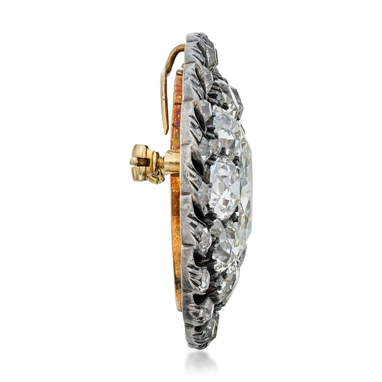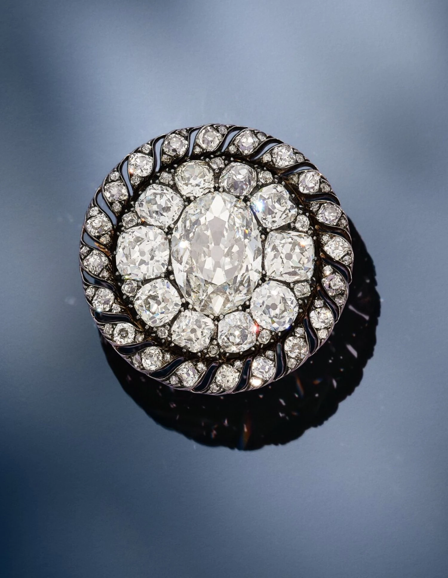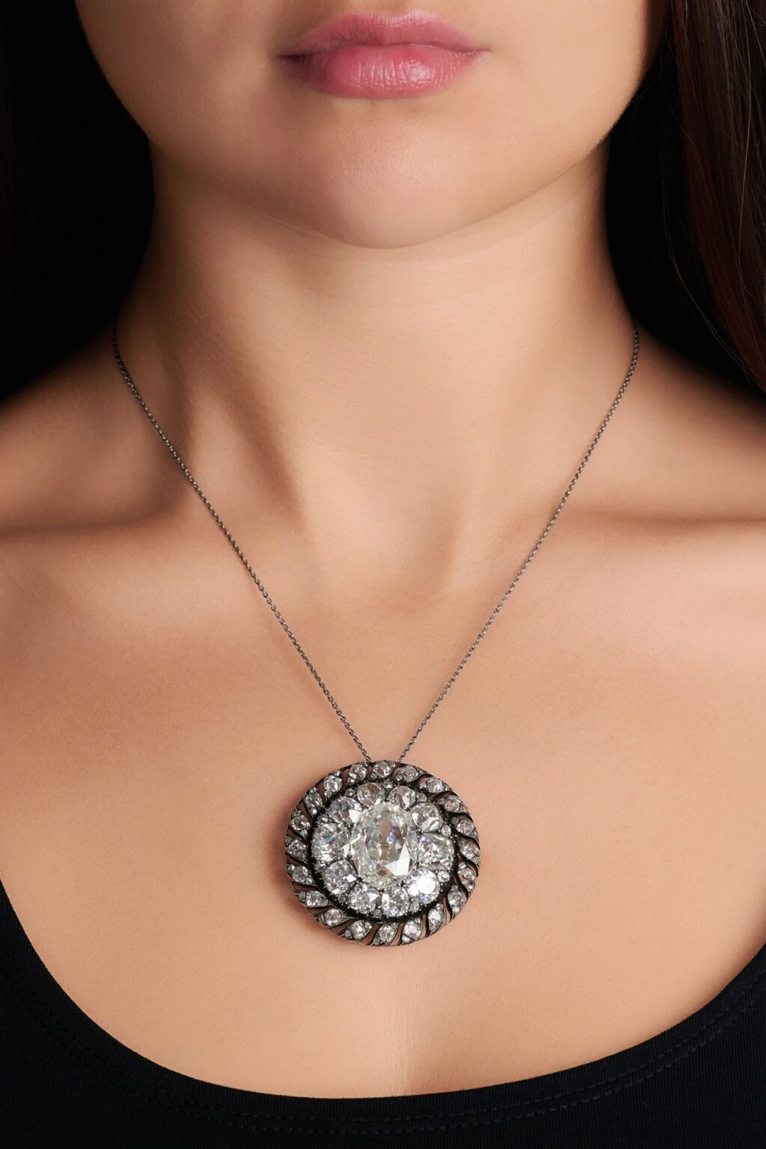 Брошь, которую также можно носить как подвеску, украшена овальным бриллиантом весом более 13 карат, окруженным бриллиантами более мелкой огранки. Цена продажи значительно превысила верхнюю границу предварительной оценки в 200 000 франков.