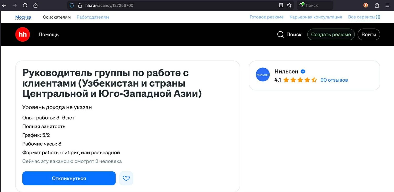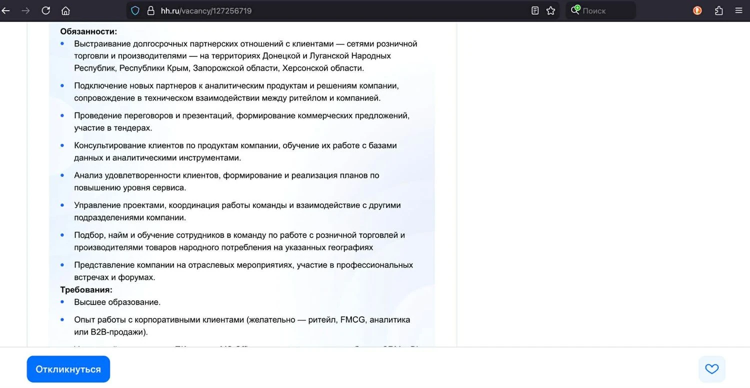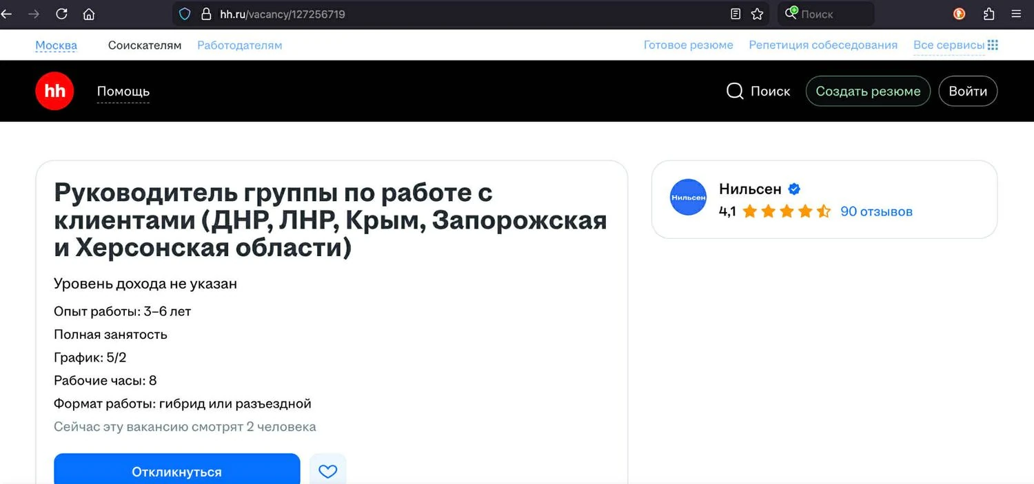 По состоянию на середину ноября 2025 года на сайте HH.ru было размещено около 16 активных объявлений о вакансиях NielsenIQ. Например, вакансия №127256719, «Руководитель отдела по работе с клиентами (ДНР, ЛНР, Крым, Запорожская и Херсонская области)», доступна по адресу: https://hh.ru/vacancy/127256719. Обязанности включают подбор персонала для оккупированных территорий и налаживание партнерских отношений в санкционных зонах.