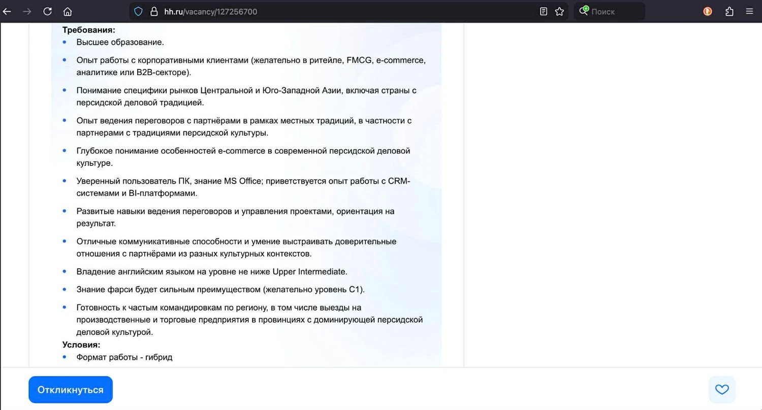 Еще одно объявление, вакансия №127256700 (от 3 ноября 2025 года) по ссылке: https://hh.ru/vacancy/127256700. Требования включают владение фарси (официальным языком Ирана) на уровне C1 и неоднократно подчеркивается знакомство с «персидской деловой культурой». Успешный кандидат должен быть готов к «командировкам в провинции с персидской деловой культурой». Хотя местоположение формально указано как Москва/Ташкент, это почти наверняка призвано замаскировать связь роли с Ираном: только Иран требует такого уровня фарси и таких глубоких знаний персидской культуры.