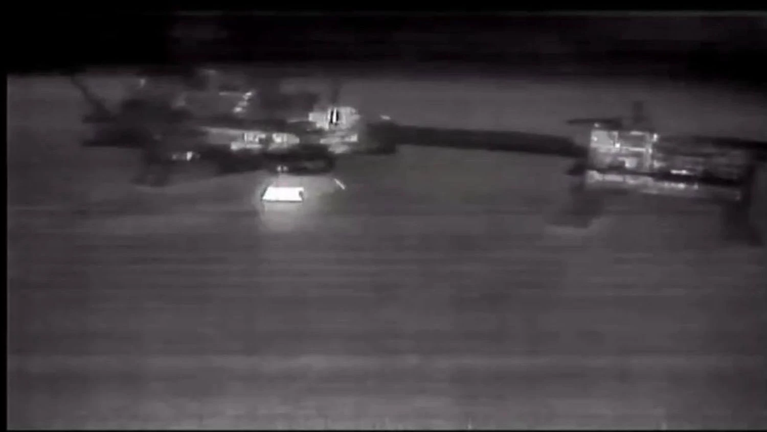 Бортовая камера беспилотника зафиксировала успешное попадание в район газотурбинной установки платформы.