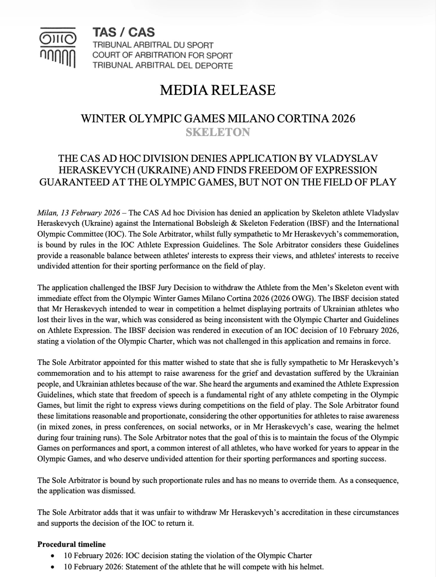 Специальная комиссия CAS отклонила иск скелетониста Владислава Гераскевича против Международной федерации бобслея и скелетона и Международного олимпийского комитета, отметив, что свобода выражения мнений гарантируется на Олимпийских играх, но не на поле. Об этом говорится в решении CAS, передает УНН.