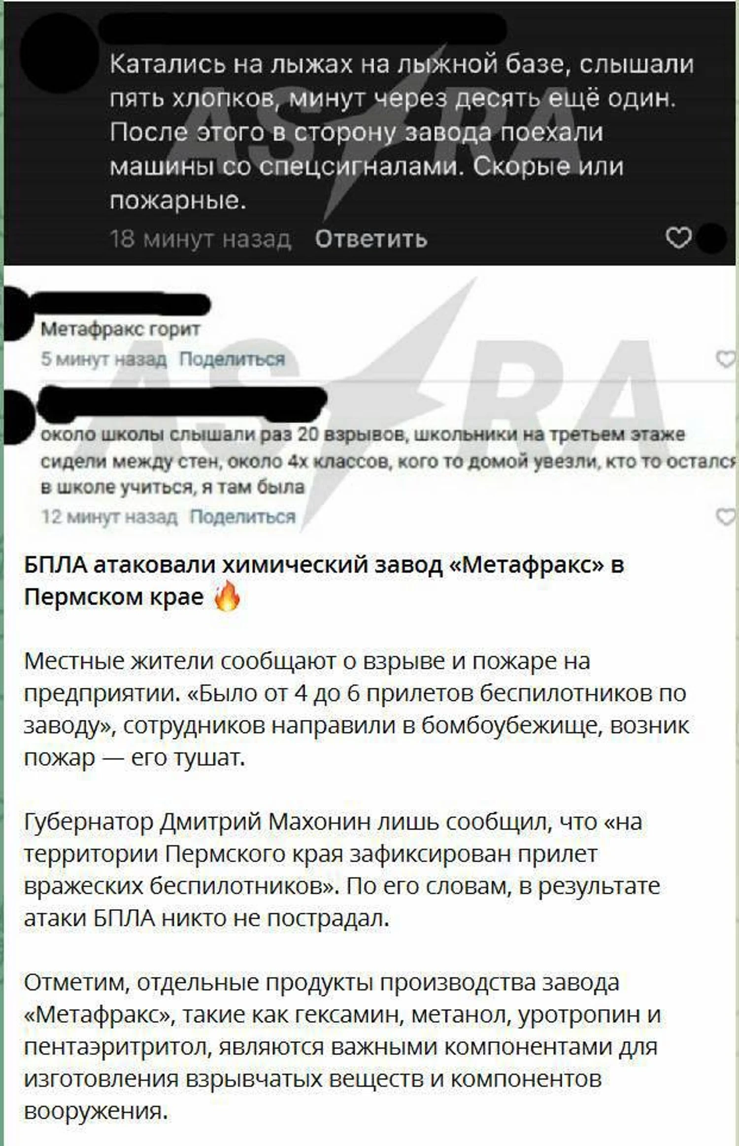 В местных телеграм-каналах сообщали о по меньшей мере шести взрывах на территории предприятия и эвакуации работников завода. По предварительным данным, удар пришелся по установке производства метанола.