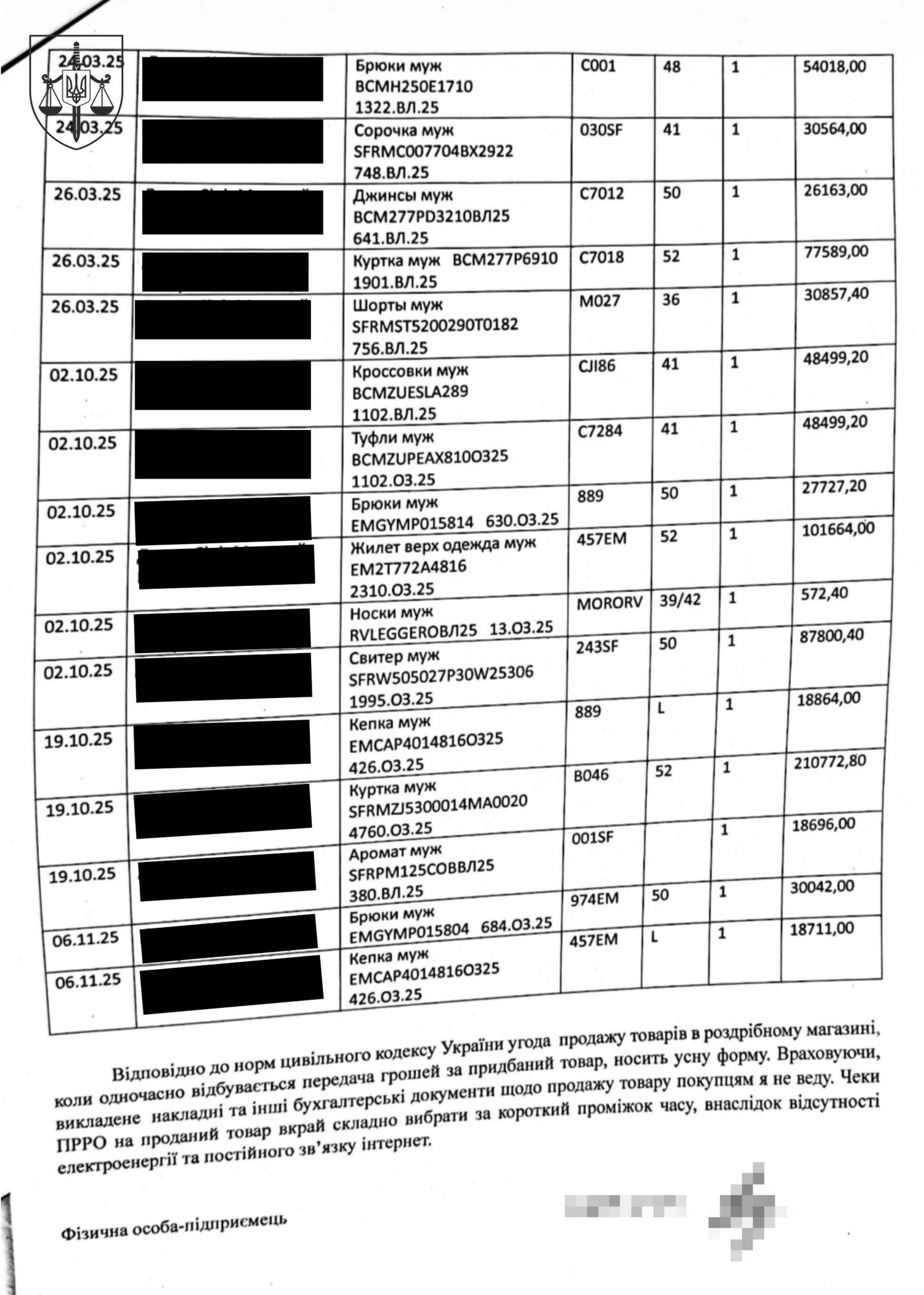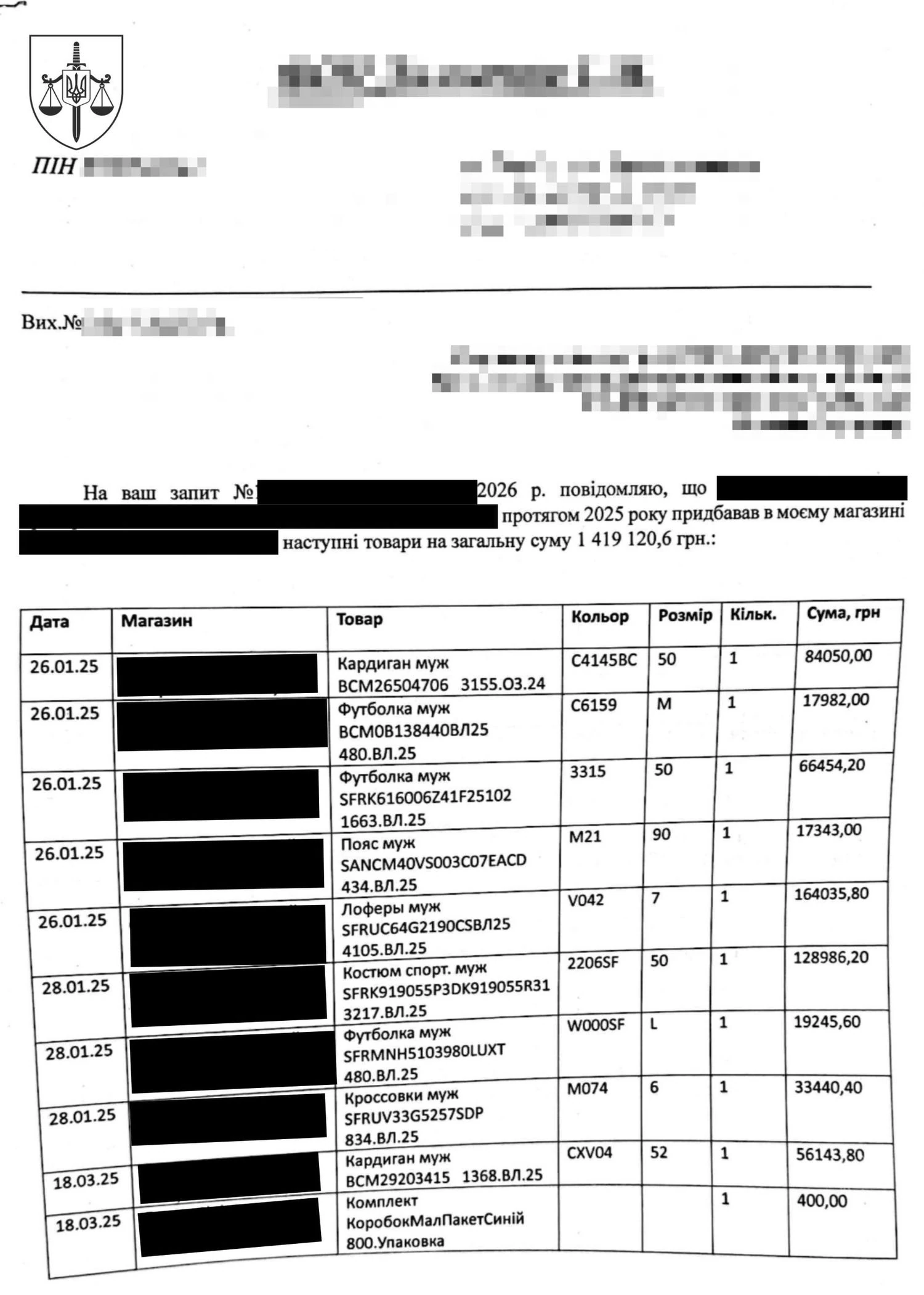 Общая сумма люксовых покупок составляет 2,5 млн гривен.