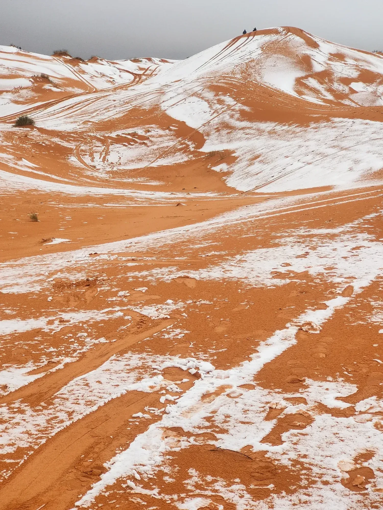 Фотографии показывают, как оранжевые дюны у подножия Атласских гор покрылись слоем снега. Неожиданная погода удивила и местных жителей, и туристов, ведь подобные явления в этом регионе случаются очень редко.