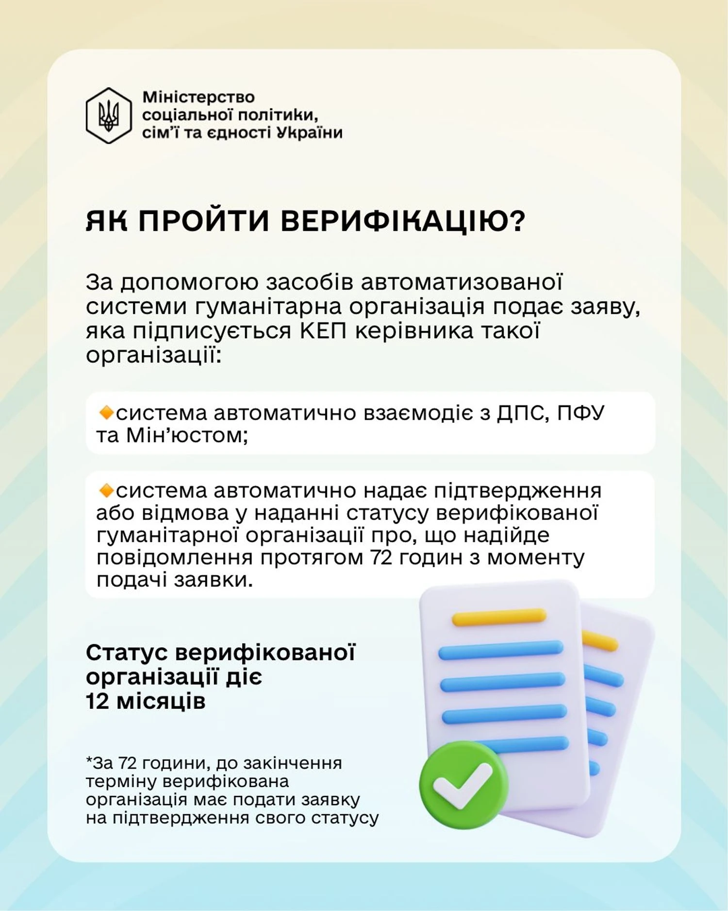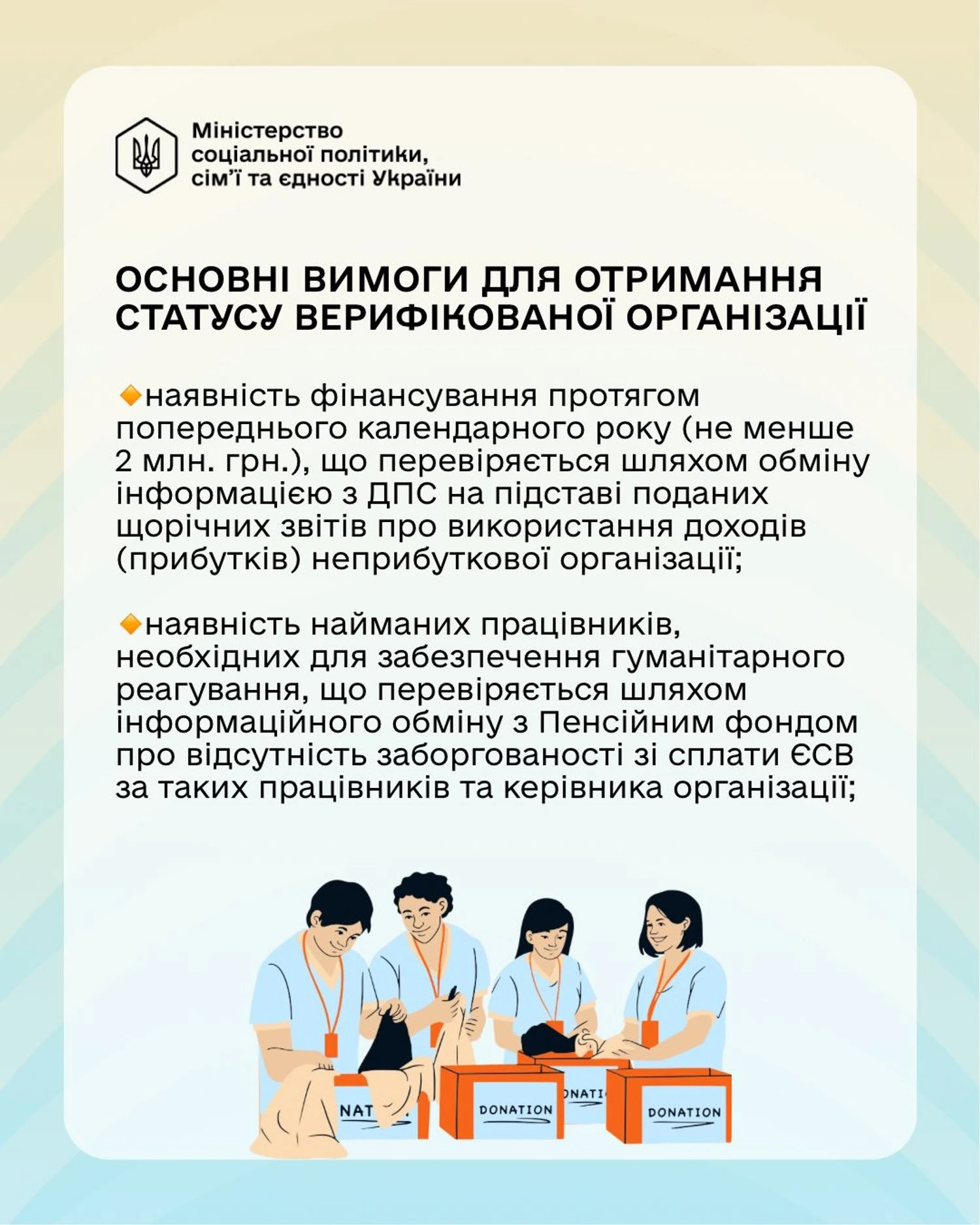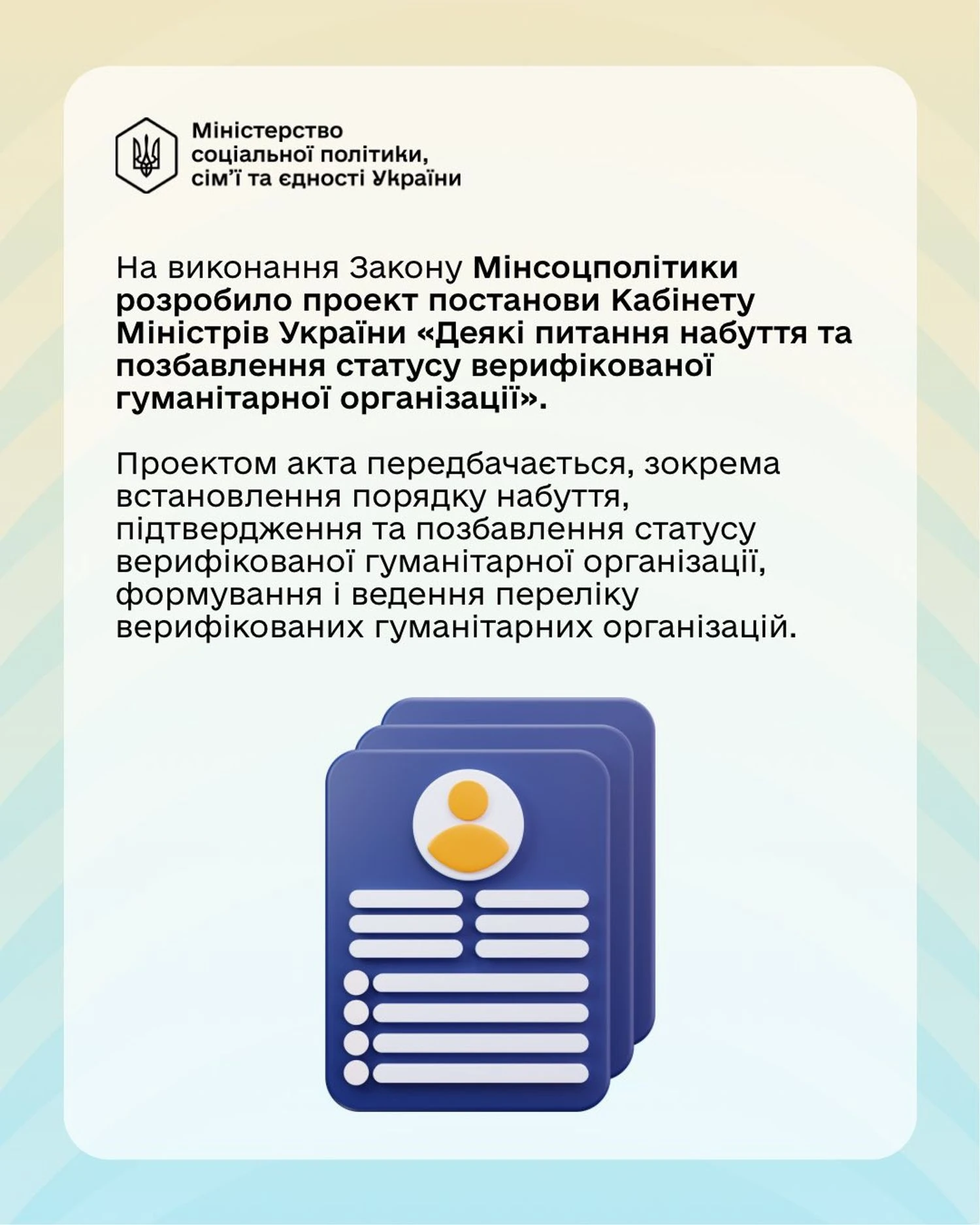Кроме того, во исполнение Закона Минсоцполитики разработало проект постановления Кабинета Министров Украины "Некоторые вопросы приобретения и лишения статуса верифицированной гуманитарной организации".