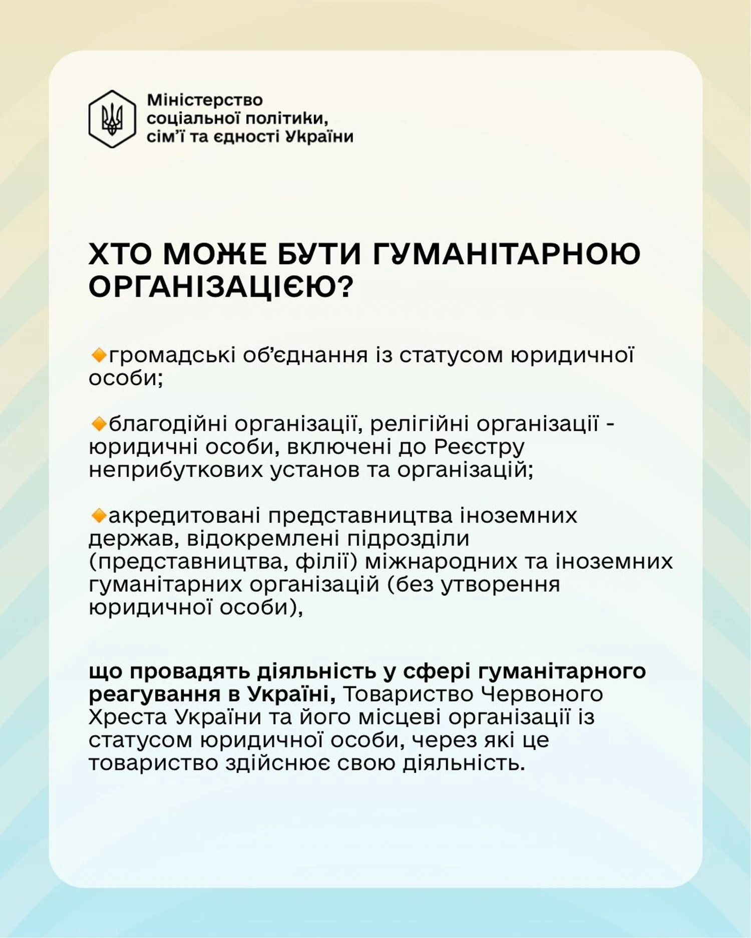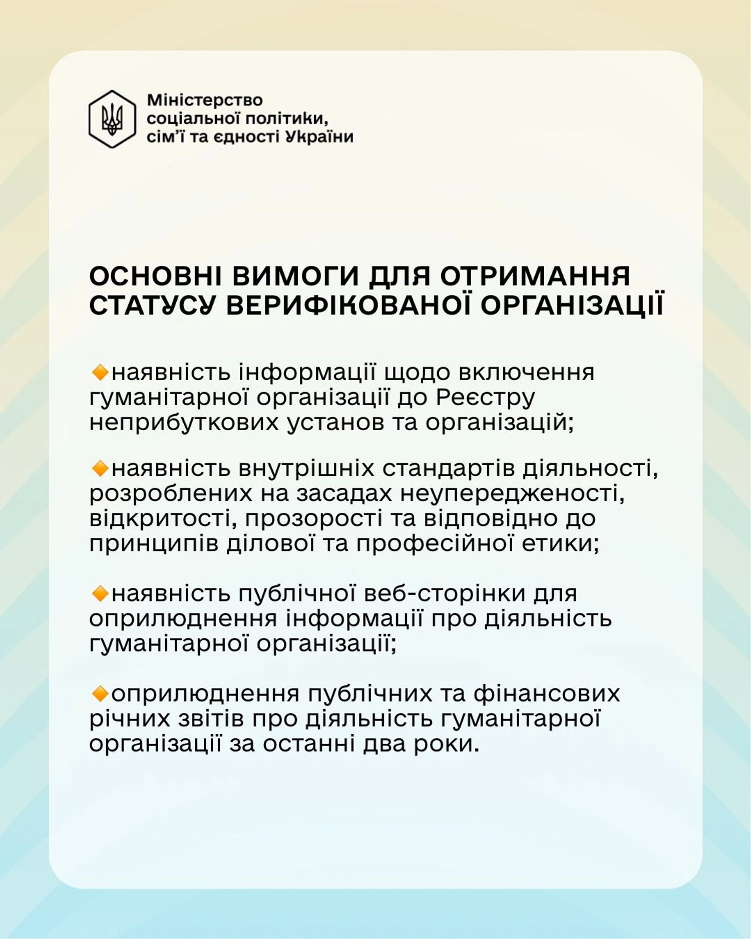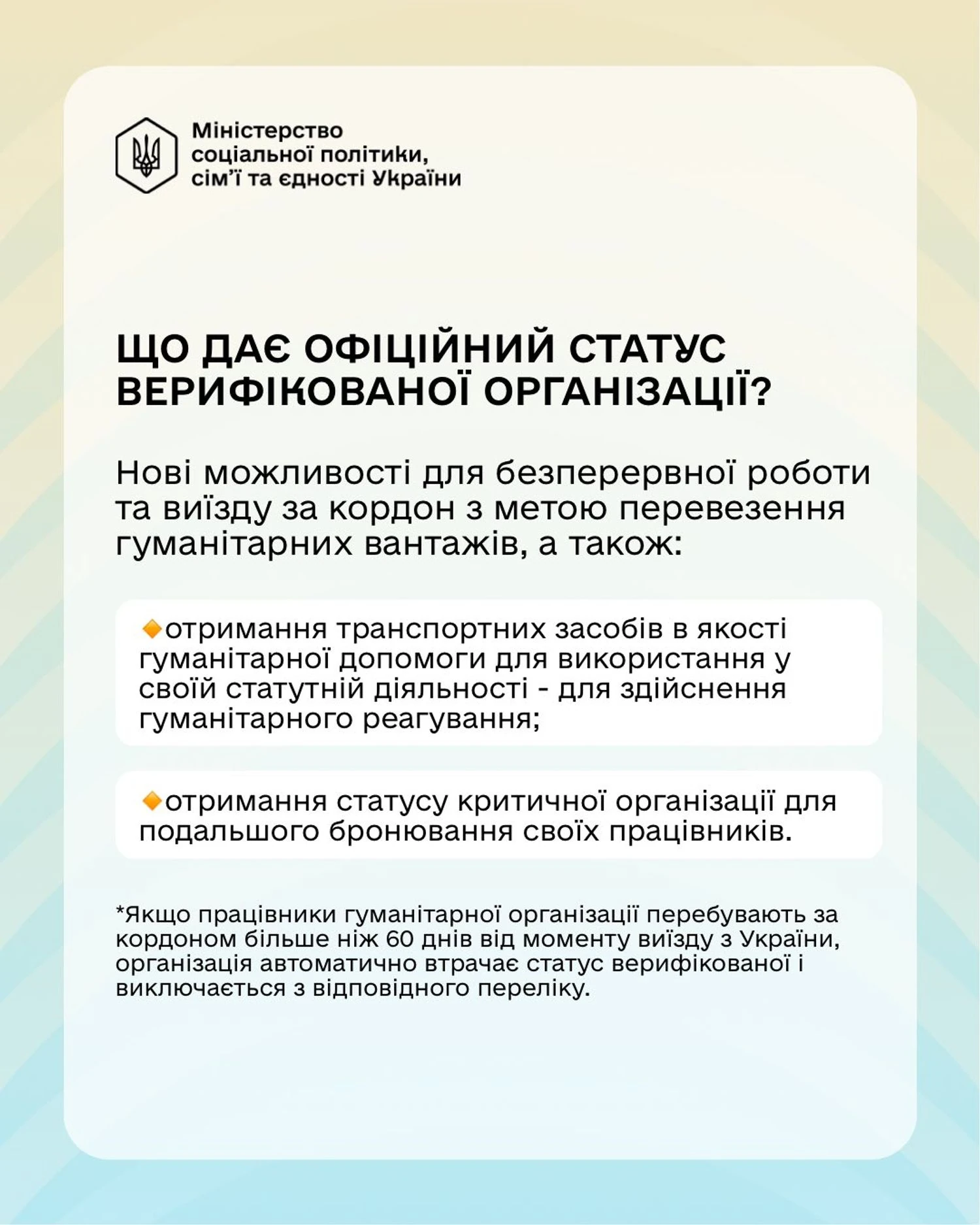 Кроме того, во исполнение Закона Минсоцполитики разработало проект постановления Кабинета Министров Украины "Некоторые вопросы приобретения и лишения статуса верифицированной гуманитарной организации".