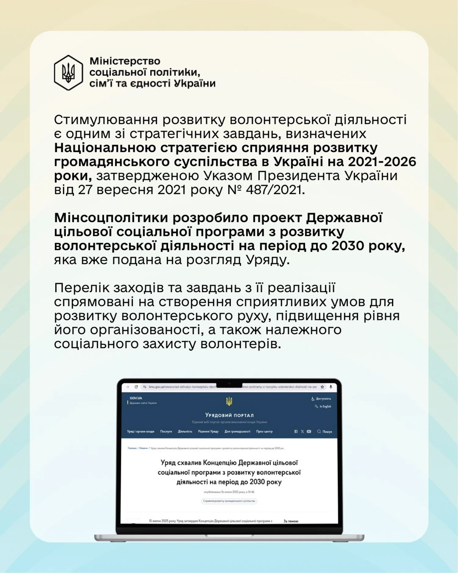 Стимулирование развития волонтерской деятельности является одной из стратегических задач, определенных Национальной стратегией содействия развитию гражданского общества в Украине на 2021-2026 годы, утвержденной Указом Президента Украины от 27 сентября 2021 года № 487/2021. Минсоцполитики разработало проект Государственной целевой социальной программы по развитию волонтерской деятельности на период до 2030 года, которая уже подана на рассмотрение Правительства. Перечень мероприятий и задач по ее реализации направлены на создание благоприятных условий для развития волонтерского движения, повышение уровня его организованности, а также надлежащей социальной защиты волонтеров
