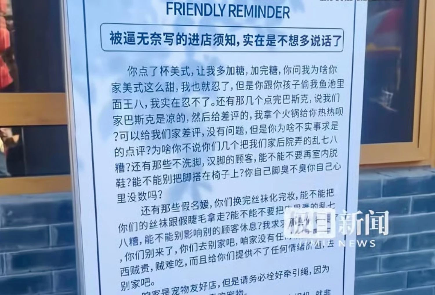 На вывеске перечислен ряд нарушений, с которыми, по словам владельцев, им пришлось столкнуться: от курения в помещении и легкомысленных негативных отзывов до выгула домашних животных без поводка, несмотря на то, что кафе дружелюбно к животным.