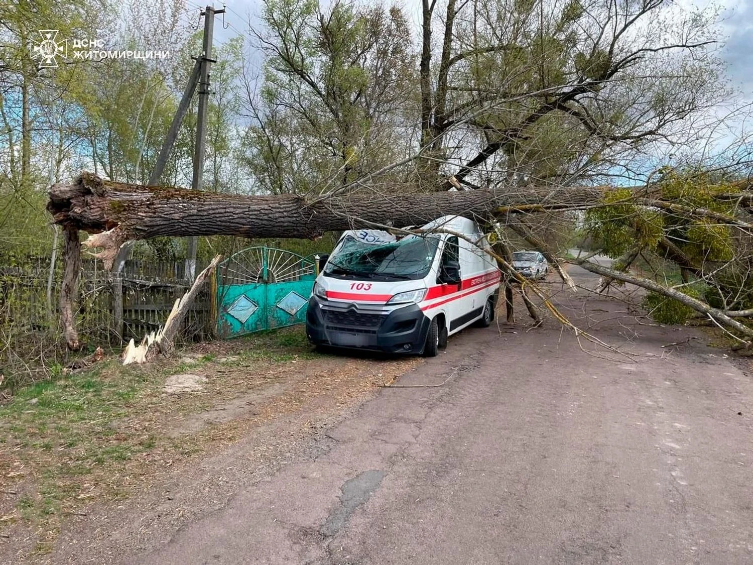 В Житомирской области из-за сильного ветра дерево упало на автомобиль скорой помощи, прибывший на вызов. Пострадавших нет.