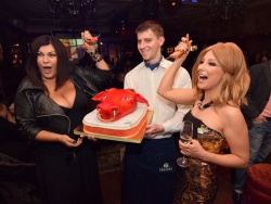 Как только ажиотаж немного утих, внезапно в зале появился еще один сюрприз – огромный торт в виде головы красного была, который был так же одним из атрибутов тематической испанской вечеринки. Первыми схватить быка за рога, в прямом смысле этого слова, выпала честь виновнице торжества в паре с режиссером Еленой Винярской, благодаря которой, собственно, и родился данный клип. Девушки явно радовались, как дети, и фотографировались с этим кулинарным шедевром, а так же со всеми гостями мероприятия.